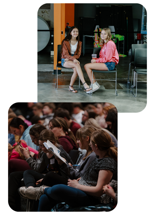Middle School groups include an hour of large group time and thirty minutes of group time. During large groups, students are led in musical worship, participate in fun games, and then have a time of teaching. Afterward, students are broken into age and gender-specific groups for a time of deeper study, conversation, and relationships with adult leaders and peers.