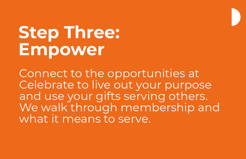 Growth Track is our three-part, monthly experience that's designed to help you grow in your relationship with God, learn about your God-given gifts, and become a member of Celebrate.